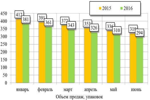 Как видно из данных рисунка 4, объем продаж измеряемый в упаковках в аптеке «Панацея-22» в первом полугодии 2016 сократился относительно аналогичного периода 2015 года на 20-30 штук ежемесячно, что привело к снижению продаж амоксициллина с 2183 упаковки за первое полугодие 2015 года до 2016 упаковок в первом полугодии 2016 года. Падение спроса на 7,6% стало следствием экономических проблем у населения.