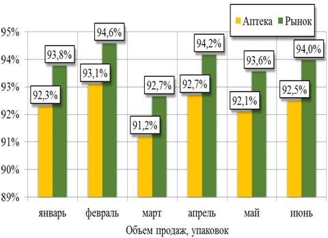 Как видно из данных рис. 6, темпы роста продаж амоксициллина в аптеке «Панацея-22» отстают от среднерыночных темпов роста в среднем на 1-2 процента ежемесячно.
