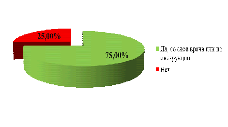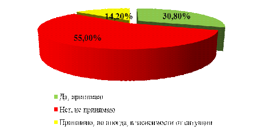 При проведении опроса было выявлено, что 74 (30,8%) респондентов принимают антибиотики без назначения врача. 132 (55%) пациентов отметили, что не принимают антибиотики без врачебного назначения, так как считают, что это может принести вред. И лишь 34 (14,2%) посетителя отметили, что приобретают антибиотики в зависимости от сложившейся ситуации.