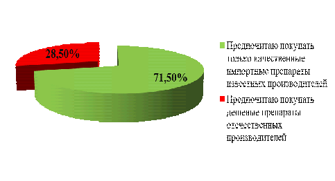 Таким образом, в ходе исследования нами выявлено, что почти 40% опрошенных полагаются на свой выбор, что может привести к риску приобретения дешевых неоригинальных небрендированных антибиотиков, а это в свою очередь приводит к низкой эффективности антибиотикотерапии.