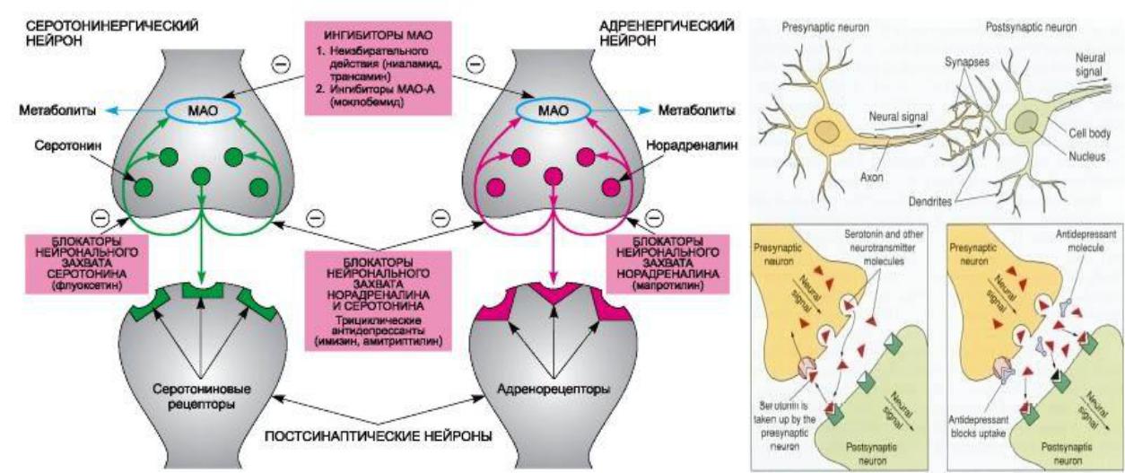 А) ингибиторы обратного захвата нейромедиаторов - препятствуют захвату нейромедиатора из синаптической щели пресинаптической мембраной: