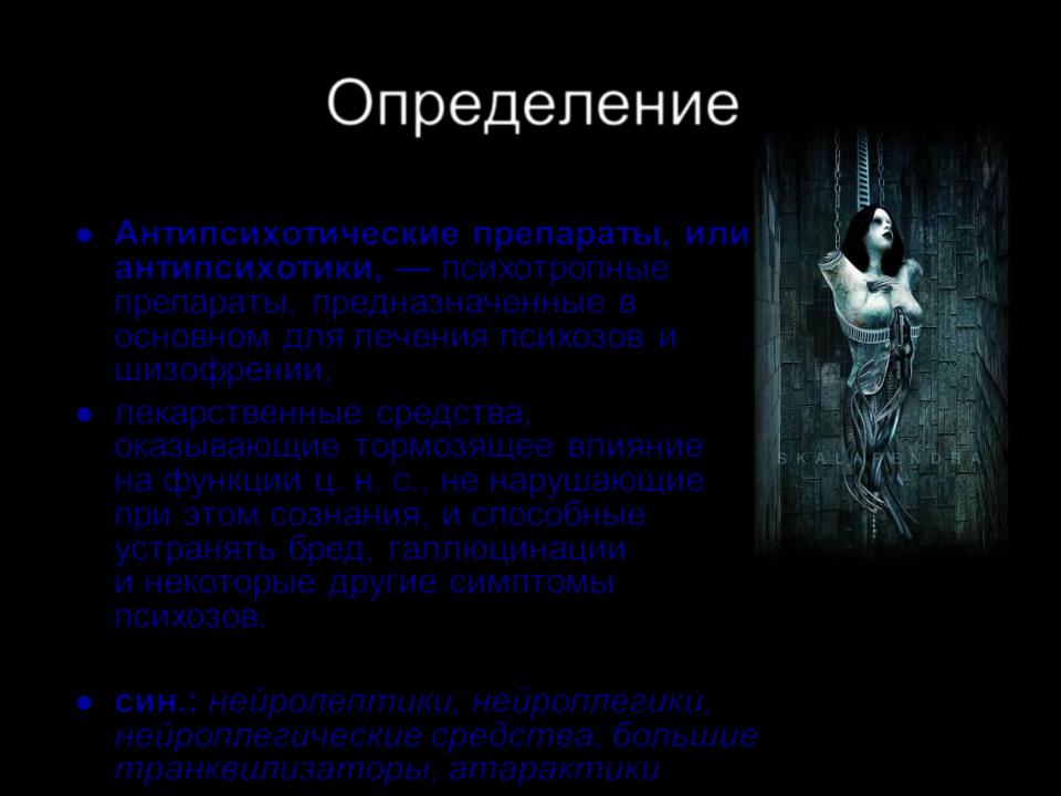 син.: нейролептики, нейроплегики, нейроплегические средства, большие транквилизаторы, атарактики