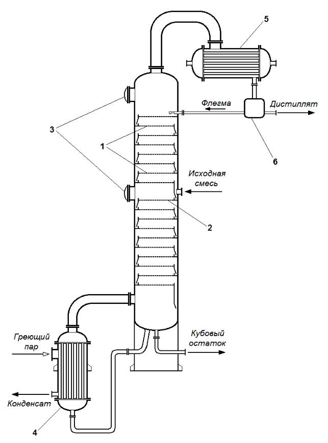1 – ситчатые переливные тарелки; 2 – тарелка питания; 3 – люки для обслуживания; 4 –кипятильник; 5 – дефлегматор; 6 – флегмоделитель