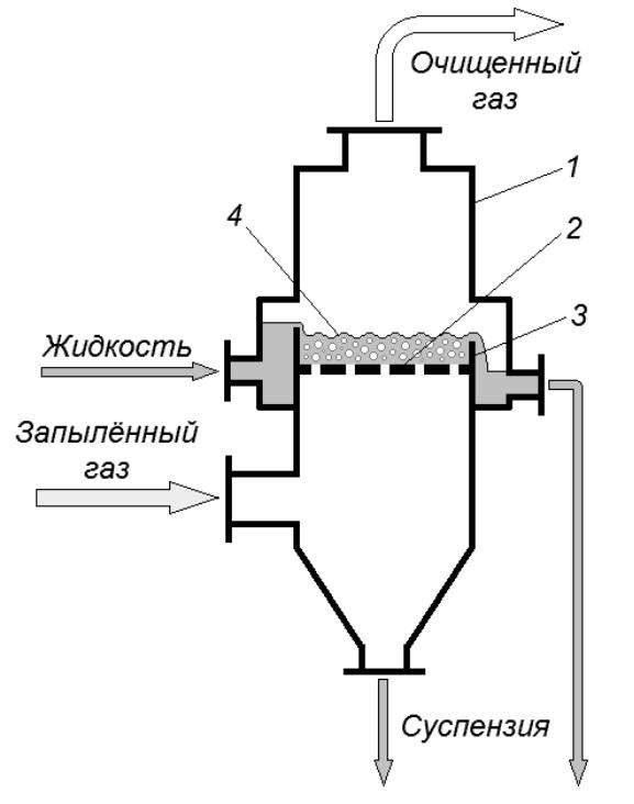 1 – корпус; 2 – перфорированная тарелка; 3 – переливной порог; 4 – барботажный слой
