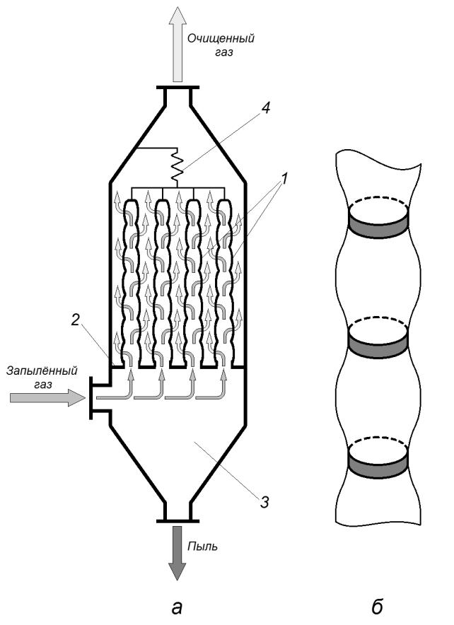 1 – рукава; 2 – трубная решётка; 3 – разгрузочный бункер; 4 – устройство для встряхивания рукавов