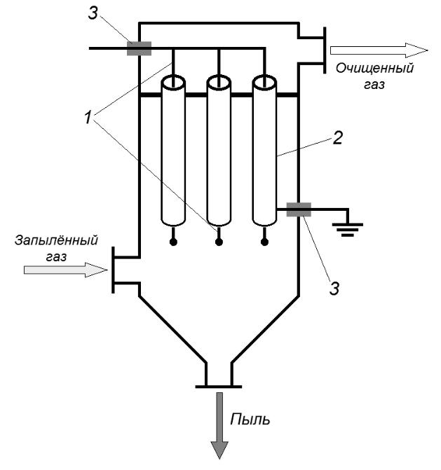 1 – коронирующие электроды; 2 – осадительные электроды; 3 – изоляторы