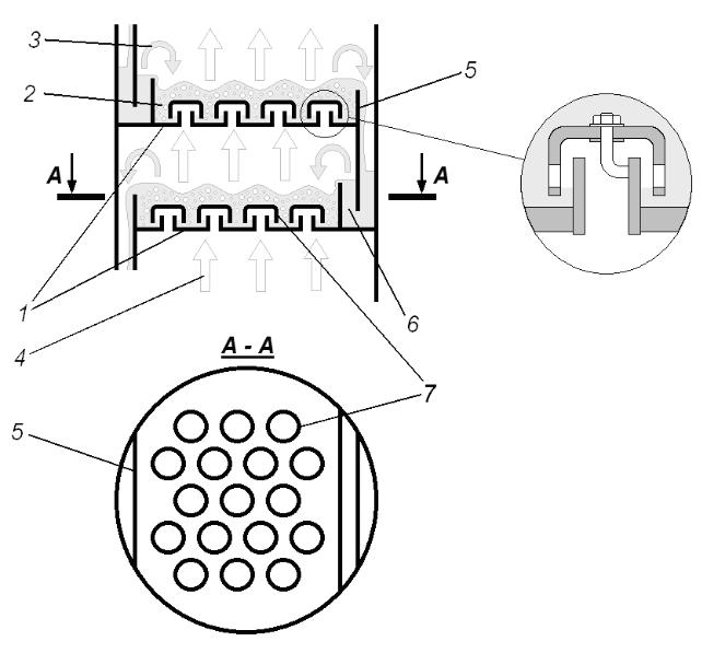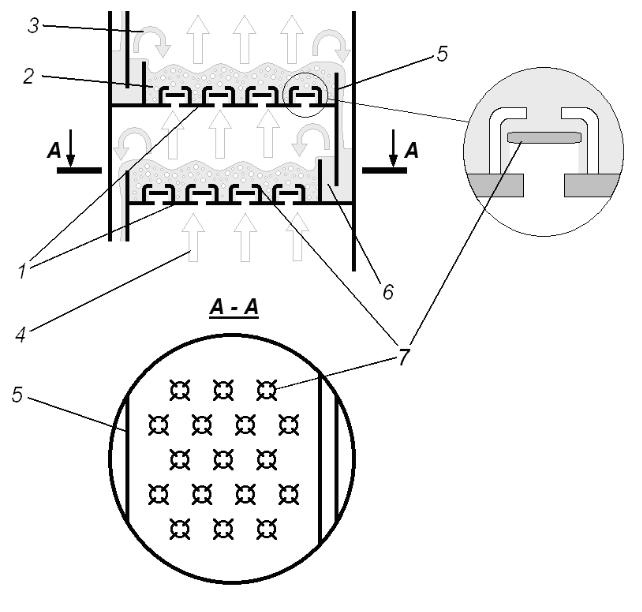 1 – тарелки; 2 – барботажный слой (пена); 3 – поток жидкости; 4 – поток газа; 5 – переливной порог; 6 – гидрозатвор; 7 – клапаны