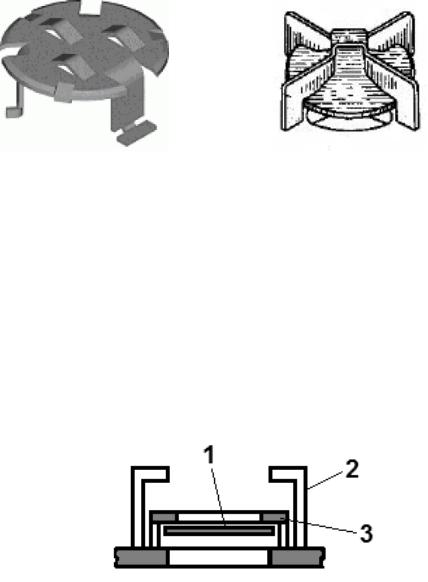 высота подъёма диска определяется ограничителями. Обычно эта высота не превышает 8 мм. Клапаны имеют диаметр 45–50 мм. Ограничители круглых клапанов выполняются обычно в виде 3–4 направляющих «ножек» и крепятся либо к самому диску клапана (рис. 23, а), либо к тарелке вокруг диска