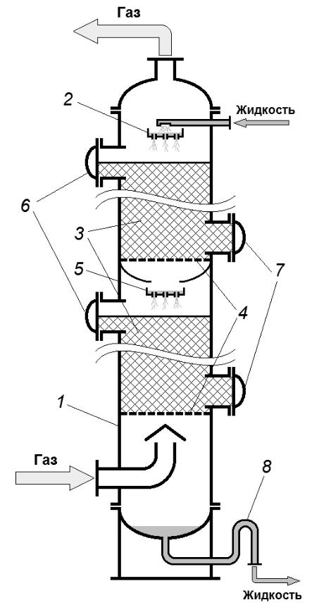 1 – корпус; 2 – распределительная тарелка; 3 – сегменты насадки; 4 – опорные решётки; 5 – перераспределительные тарелки;