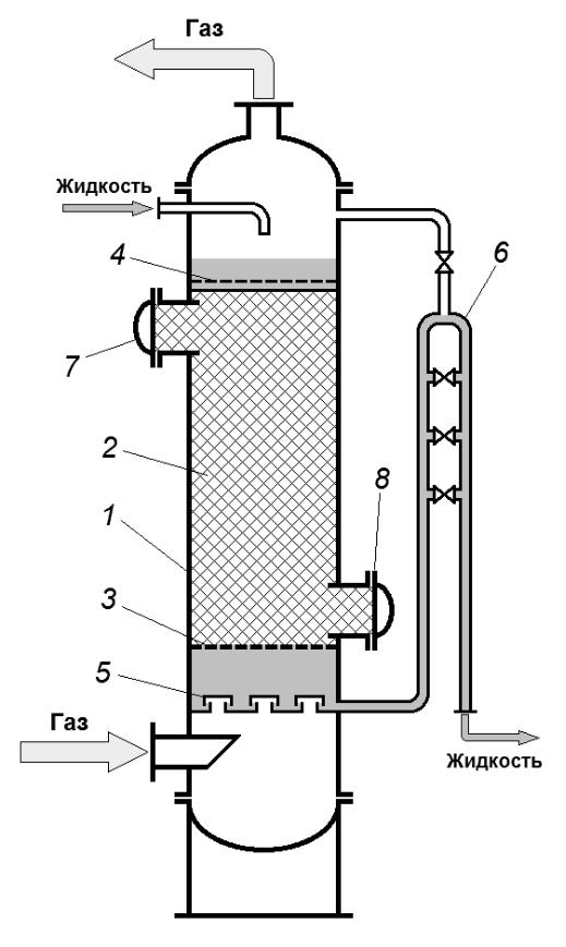 1 – корпус; 2 – насадка; 3 – опорная решётка; 4 – сетка, фиксирующая насадку; 5 – газораспределительная тарелка; 6 – гидрозатвор; 7 – люк для загрузки насадки; 8 – люк для выгрузки насадки