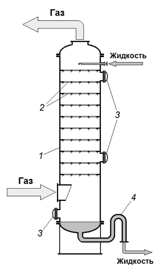 1 – корпус; 2 – тарелки; 3 – люки для обслуживания; 4 – гидрозатвор
