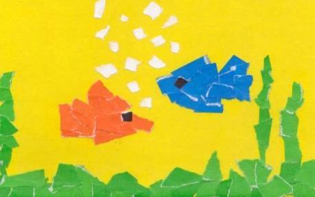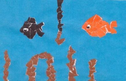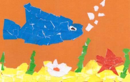 В начале урока была создана благоприятная эмоциональная обстановка для продуктивной работы учеников. Детям было предложено на уроке создать обрывную аппликацию и в связи с этим им был задан вопрос: Как создать обрывную аппликацию? Все дети ответили, что бумагу нужно рвать руками, а не резать ножницами. Затем, детям было объяснено, что при работе с обрывной аппликацией у бумаги должны быть неровные края, для этого ножницы не нужны - пальцы рук используются вместо ножниц. Детям было предложено потренироваться и разорвать небольшой кусок бумаги на несколько частей. Далее детям было предложено создать каждому свой подводный мир, используя технику «обрывная аппликация», и придумать историю этого мира. Было объяснено, что сначала нужно нарисовать композицию - жителей подводного мира и потом закрасить их кусочками цветной бумаги. На доске были вывешены примеры работ, но было оговорено, что дети должны создать индивидуальные работы, не похожие на образцы.