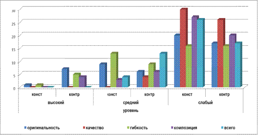 Из данной таблицы видно, что в контрольном эксперименте у детей повысился показатель уровня оригинальности и составления композиции.
