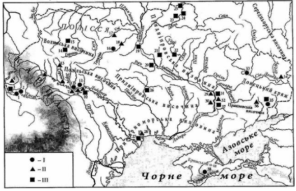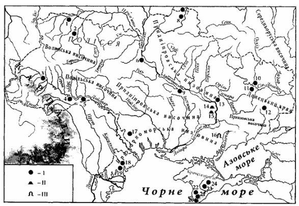 1– Нобель; 2 — Корост; 3 -- Галич; 4 — Атаки; 5 — Молодове, Кормань; б — Таценки; 7 — Пісочний Рів; 8 — С.мяч; 9 — Велика Андрусівка; 10 —Дробишеве; 11 — Минівський Яр; 12 — Мослине; ІЗ — Ігрень; 14 — Волоське; 15 — Васіїлівка; 16 --Кам 'яна Могила; 17 — Гіржовє; 18 — Білолісся; 19 — Мирне; 20 — Ласпі; 21 — Шан-Кооа, Фатьма-Коба, Мурзак-Коба; 22 — Сюрень II; 23 — Буран-Кая; 24 — Кукрек.