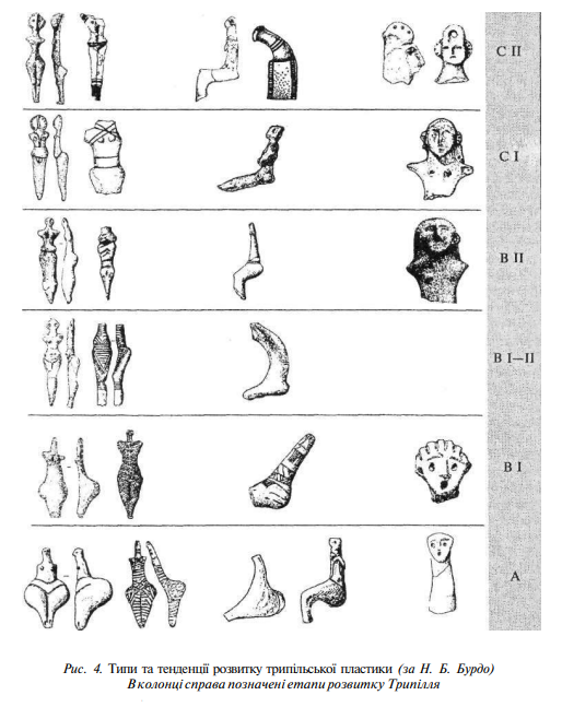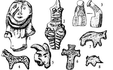 І, 2, 3, 6 — антропоморфні статуетки; 4, 5, 7, 8 — зооморфні скульптурні зображення.