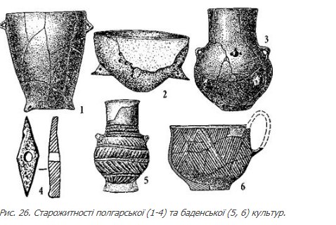в середині III тисячоліття до н.е. змінює полгар-ську. Велика кількість пам'яток цієї культури відома в Подунав'ї на території Чехії, Словаччини, Угорщини та інших сусідніх країн. На Закарпатті баденські поселення виділені недавно, відомо їх тут всього близько десяти (Великі Лази, Мукачеве та ін.).