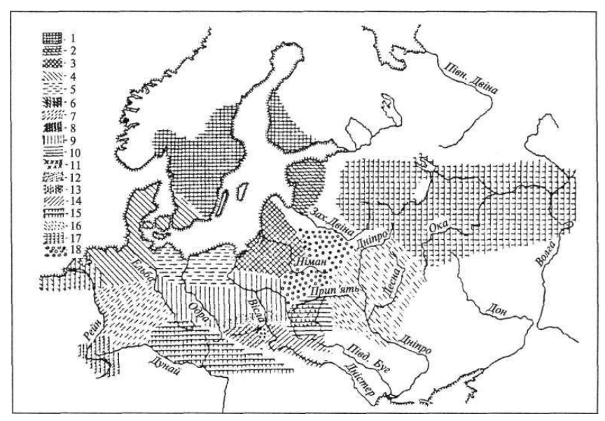 / — культура човноподібних сокир; 2 — естонська культура; З — жуцевська культура; 4 — культура поодиноких поховань; 5 — одерська культура; 6 — культура нижньорейнських кубків; 7 — саксоно-тюрінгська культура; 8 — культура верхньорейнських кубків; 9 — "польська" культура шнурової кераміки; 10 — городоцько-здовбицька культура; // — культура Злота; 12 — межановицька культура; 13 — стжижовська культура; 14 — підкарпатська культура; 15 — чесько-моравська культура; 16 — середньодніпровська культура; 17 — фатьянівська культура; 18 — культури Білорусі та Литви (за І. К. Свешниковым)