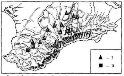 1 — Старосілля, Бахчисарайська стоянка, Улакли; 2 — Шайтан-Коба, Тав-Бодрак; З — Кабазі; 4 — Чокурча; 5 — Вовчий Грот; 6 — Кіїк-Коба, Кош-Коба; 7 — Буран-Кая; 8 — Сари-Кая; 9 — Пролом; 10 — Заскельне, Ак-Кая, Альошин Грот; П —Аджи-Коба; 12 — Качинський навіс; ІЗ — Сюрень І.