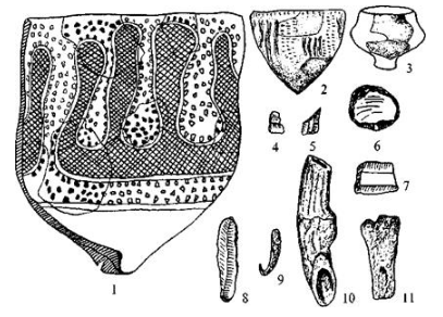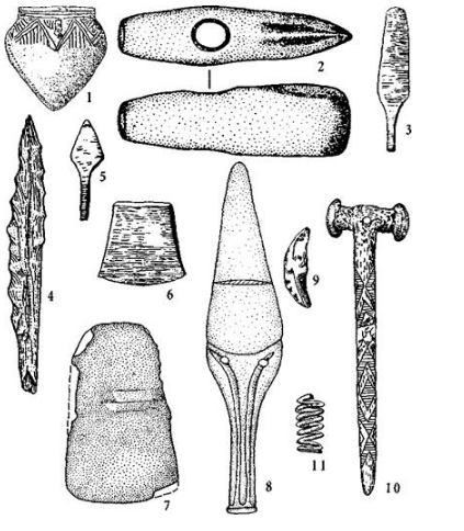 1 — глина; 2 — камінь; 3, 5-8 — мідь; 4, 9, 10 — кістка; 11 — срібло.