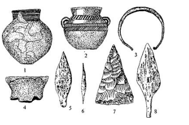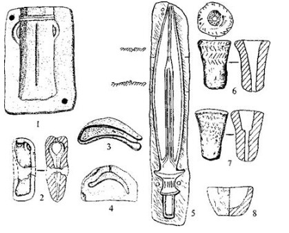 5, 6 — мідь; 3,8 — бронза; 7 — кремінь.