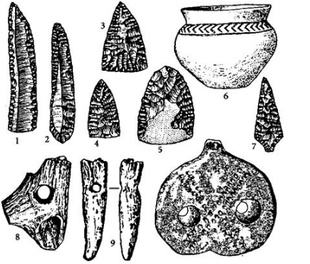 1, 5 — глина; 2-4, 6 — кремінь; 7-9 — кістка.