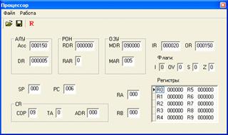 В окне «Процессор» отражаются текущие значения регистров и флагов.