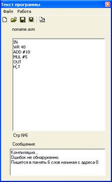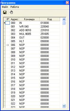 Окно Программа позволяет наблюдать процесс прохождения программы. В этом окне ничего нельзя редактировать. Органы управления окна позволяют сохранить содержимое окна в виде текстового файла, выбрать начальный адрес области ОЗУ, которая будет дизассемблировать, а также установить/снять точку останова.