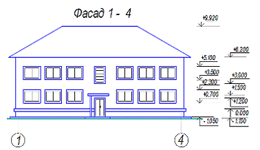 здания. На чертежах фасадов указывают отметки уровня земли, верха стен, входных
