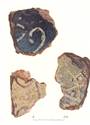 Кроме того, в грунте, перекопанном многочисленными позднейшими захоронениями и пронизанном строительными остатками прошлых столетий, было найдено много обломков майоликовых[2, с. 109] плиток пола размером 15,5*15,5 см. со скосом и выпуклыми бортами по краям тыльной стороны; они преимущественно жёлтого и зеленого цвета. Но, наряду с однотонными, встречены многоцветные плитки со своеобразной «орнаментацией». Кроме этих плиток, примерно однотипных по размерам, форме и фактуре, найдена одна толстая, «кирпичеобразная», зелёная поливная плитка (5 * 16, 5* 17, 5 см.) (рис 27).