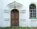 входом располагается окно, сводчатый верх которого так же украшен поребриком в