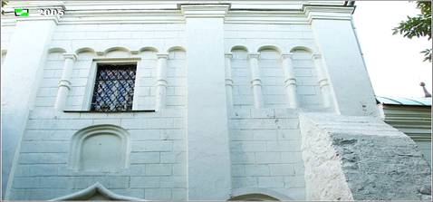 Северный вход в Рождественский собор увенчан арочно-колончатым поясом. С южной стороны фасада Спасского собора под бусиной так же располагается арочный проем с дверью. Арочный проем украшен выступающими перспективными четырехуровневыми пилястрами (см. рис. 42). Примечательно, что арочные проемы являются как бы зеркальным отражением друг друга. Окно рядом с арочным проемом и дверью Спасской церкви располагается справа, а на фасаде Рождественского собора - слева.
