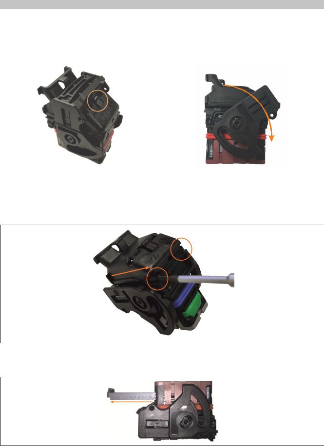 Чтобы снять крышку для кабелей, необходимо опустить зажим (например, с помощью отвертки), после чего повернуть черную защелку на 90°.