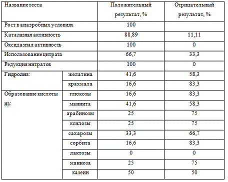 В ходе исследований нами были изучены некоторые биологические свойства микроорганизмов, такие как: способность штаммов к использованию различных сахаров (глюкоза, сахароза, маннит, лактоза, ксилоза, арабиноза, мальтоза, сорбит), цитрата, способность к гидролизу крахмала, желатина, продукции сероводорода, аммиака, индола. При изучении ферментативной активности определяли наличие у выделенных штаммов каталазы и оксидазы.