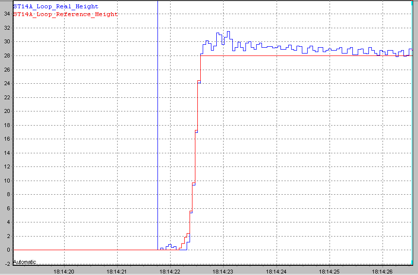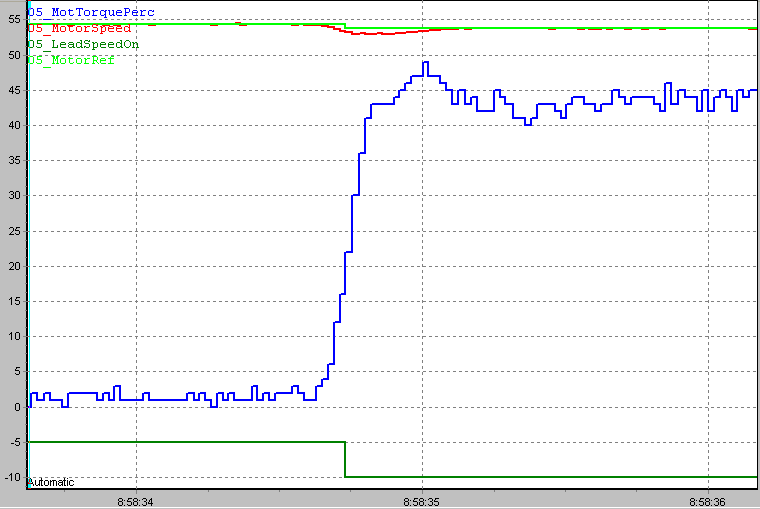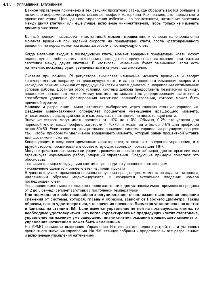 Натяжение между клетями определяется следующим образом. По сигналу "SххTENS_DB".STAT_TorqueAcqOn (определяется по положению головы заготовки) в функции чтения данных с привода SxxINPUT (FC310,320,330…) накапливается сумма момента двигателя "SххTENS_DB".STAT_TorqueSum и счетчик выборок момента "SххTENS_DB".STAT_SamplesNum. Затем сумма моментов делится на сумму выборок, т.е. определяется средний момент клети в момент времени, пока заготовка не зашла в следующую клеть (нулевое натяжение между клетями). Значение величины натяжения между клетями (#STAT_ActTension) определяется как разность момента, соответствующему нулевому натяжению и текущему значению моменту. Например, если момент клети снизился, это значит что заготовку стала сильнее тянуть следующая клеть, т.е. увеличилось натяжение между клетями. Это приводит к увеличению обратной связи регулятора, ошибка становится отрицательной, а выход регулятора увеличивается (т.к. регулятор инвертирует сигнал), что приводит к увеличению задания скорости клети и снижению натяжения между клетями (рис 2.4).