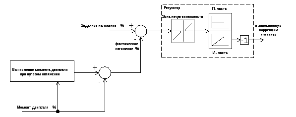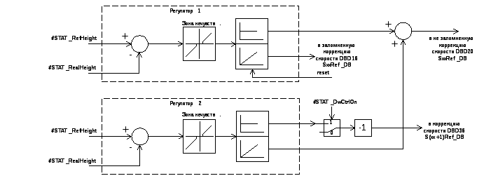 Для регулирования петли используются два функциональных блока ПИ-регуляторов FB260. Интегральная составляющая 1-го регулятора воздействует на запомненную коррекцию скорости .Выход интегратора учитывается если он больше единицы и после записи в запомненную коррекцию (см.блок формирования скорости клети ) интегральная составляющая обнуляется. Пропорциональная часть 1-го регулятора и интегральная часть 2-го воздействуют на не запомненную коррекцию скорости. Если установлен режим регулирования для последующей клети то пропорциональная часть второго регулятора (с отрицательным знаком) воздействует на скорость следующей клети (рис. 2.10).