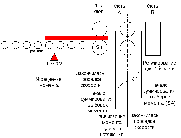 Запуск регулятора происходит (после выполнения стадий расчета момента нулевого натяжения) после того, как заготовка зашла в следующую клеть и у ее привода закончилась динамическая просадка скорости, обусловленная набросом нагрузки (рис 2.7.).