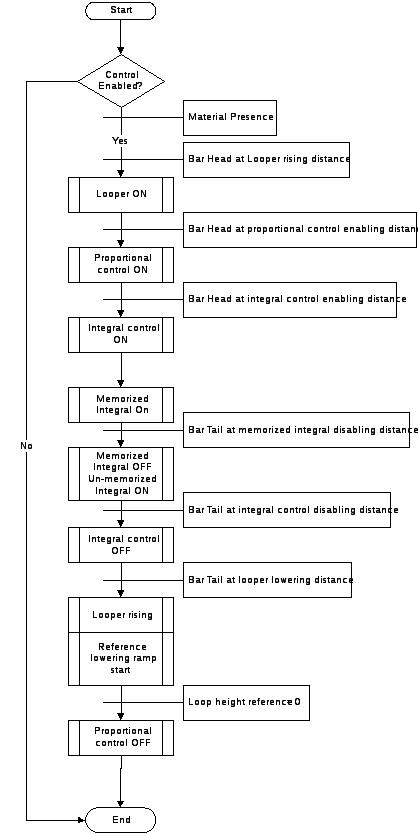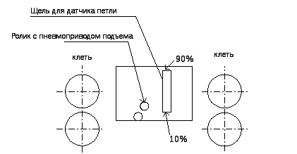 При подходе хвоста заготовки к клети опускается ролик и снижается задание регулятору петли, чтобы при выходе заготовки из клети петля была опущена.