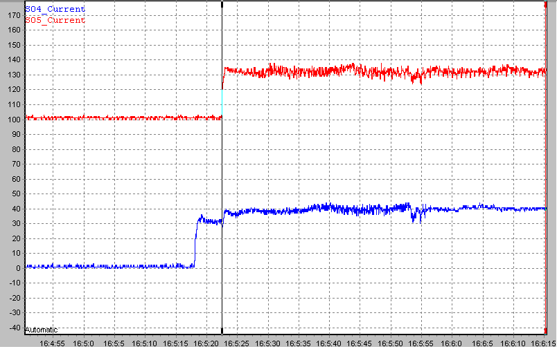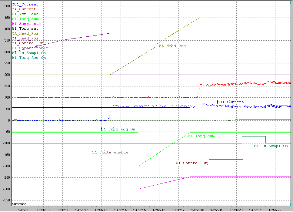Опрос значений момента, включение и отключение регуляторов натяжения происходит по сигналам системы слежения. Осциллограмма сигналов при работе регулятора натяжение показана на рисунке 2.5. На рисунке 2.6. показана последовательность регулирования натяжения, привязанная к расположению оборудования.