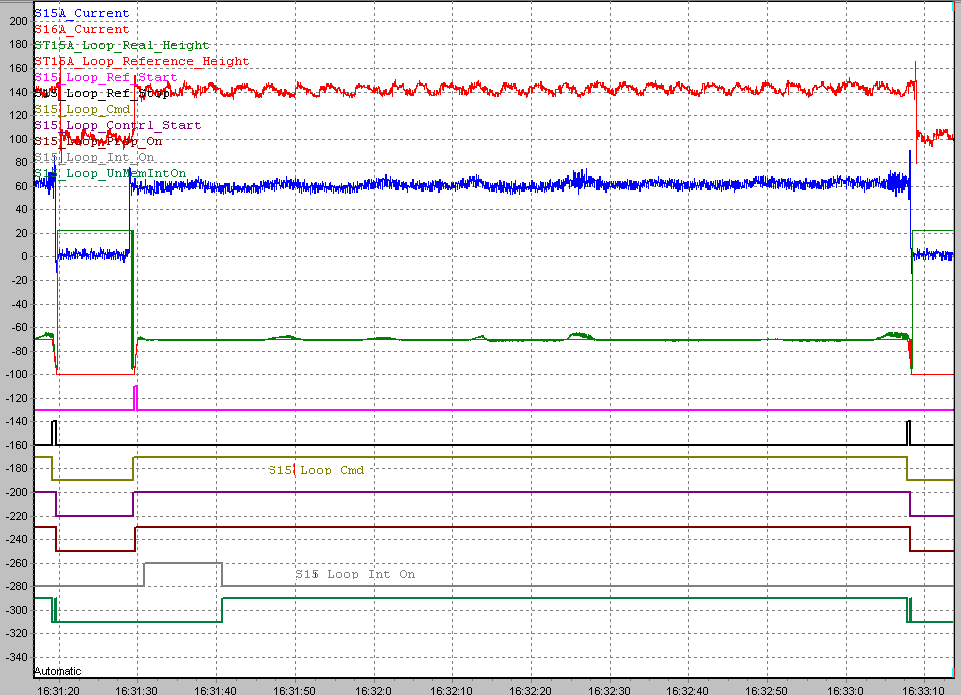 Осциллограмма сигналов при регулировании петли приведена на рисунке 2.12. Когда нет металла в зоне фотодатчика сигнал реальной высоты петли имеет максимальный уровень 100%. Уровень сигнала при опущенной петле определяется положением датчика (при установке) и положением станины лупера (может изменятся).