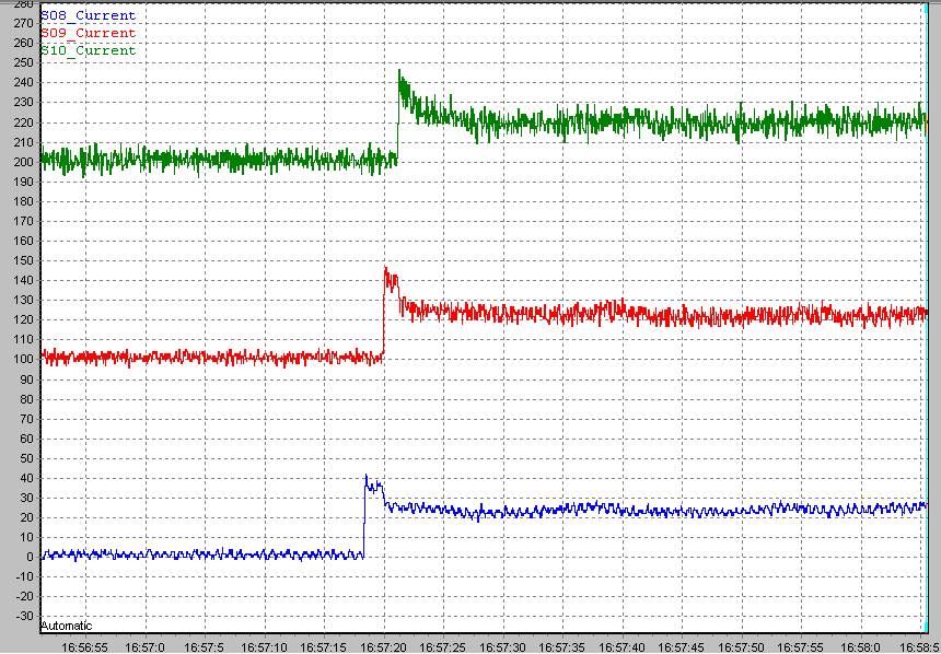 Регулирование натяжения основано на зависимости поведения тока или момента привода клети в зависимости от сжатия или растяжения материала между двумя клетями. Эти процессы иллюстрируются рисунками 2.2 и 2.3. При сжатии происходит возрастание тока предыдущей клети, при растяжении ток уменьшается после захода в следующую клеть. Пока голова заготовки не зашла в следующую клеть, момент предыдущей клети (или ее ток) определяется обжатием материала (т.е. является моментом, соот-ветствующим нулевому натяжению).
