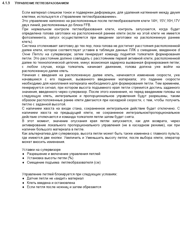 Если материал слишком тонок и подвержен деформации, для устранения натяжения между двумя клетями, используется «Контроль петлеобразования». На стане 170 петледержатели установлены в чистовой группе клетей (после 14-й,15-й,16-й,17-й клети). Перед чистовой группой (перед 14-й клетью) имеются горизонтальные петледержатели, которые разделяют каскады скоростей чистовой группы от предчистовой, т.е. позволяют регулировать скорости клетей чистовой группы не влияя на скорости клетей предчистовой, промежуточной и черновой группы.