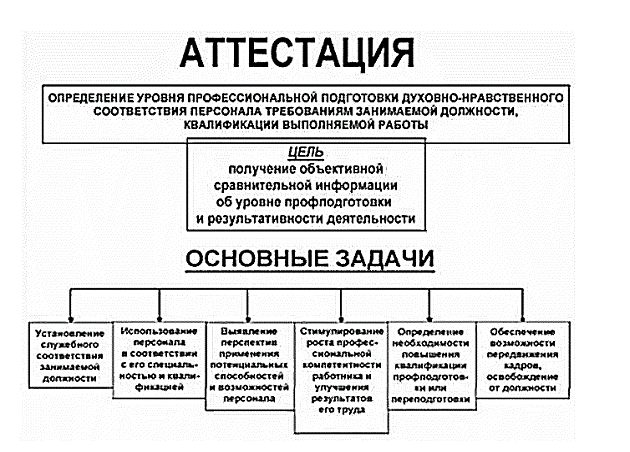 Аттестация - определение, проверка, испытание, оценка различных качеств работника, установление его служебно-должностного соответствия предъявляемым требованиям к занимаемой должности.