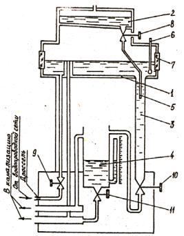 Рис. 2.1. Схема экспериментальной установки: 1 – напорный бак; 2 – резервуар с краской; 3 – трубка стеклянная диаметром 20×1,25 мм; 4 – мерный бак; 5 – трубка с краской; 6 – термометр; 7 – смотровое стекло; 8 – вентиль, регулирующий поступление краски; 9 – вентиль, регулирующий подачу воды в напорный бак; 10 – вентиль, регулирующий расход; 11 – вентиль, регулирующий заполнение водой мерного бака