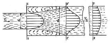 Из неустойчивой вихревой зоны основной поток периодически захватывает отдельные вихри и уносит их по течению. Затраты энергии на поддержание вихревых зон и унос вихрей являются причиной потерь при внезапном расширении. Подобные явления характерны и для других местных сопротивлений, в которых поток обтекает острые кромки задвижек, диафрагм и пр. В большинстве случаев теоретически не удается определить величину местных сопротивлений, поэтому вид зависимости, найденный теоретически для случая внезапного расширения (теорема Борда), обобщают на все случаи местных сопротивлений: