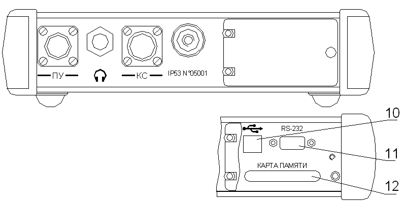 - левый соединительный разъем «КС» – для коммутации между собой блока управления и индикации, блока ультразвукового многоканального и аккумулятора;