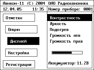 6.4.1.3 При работе в затемненных условиях (помещение, тоннель и пр.) следует включить подсвет экрана, для чего переместить инверсное поле с «контрастность» на «яркость» кнопкой « », а затем увеличить яркость экрана кнопкой « ».