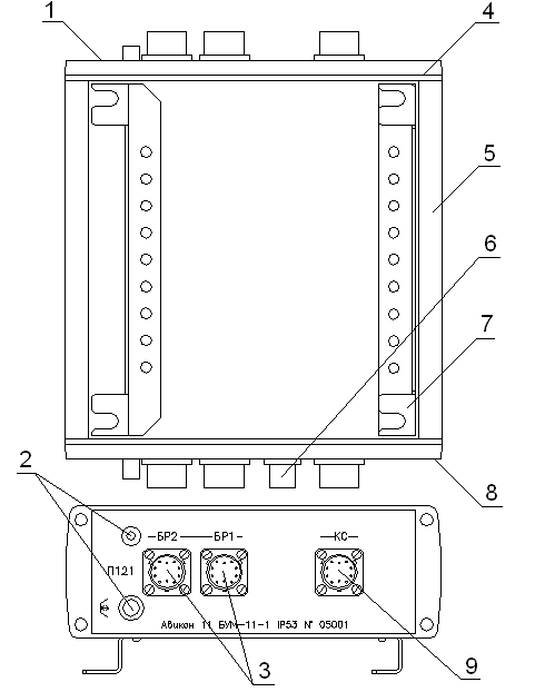 1-правая панель, 2-разъемы для подключения ПЭП, 3-разъемы для соединения с БР1 и БР2, 4-крышка, 5-корпус, 6-разъем для датчика пути, 7-опора, 8-левая панель