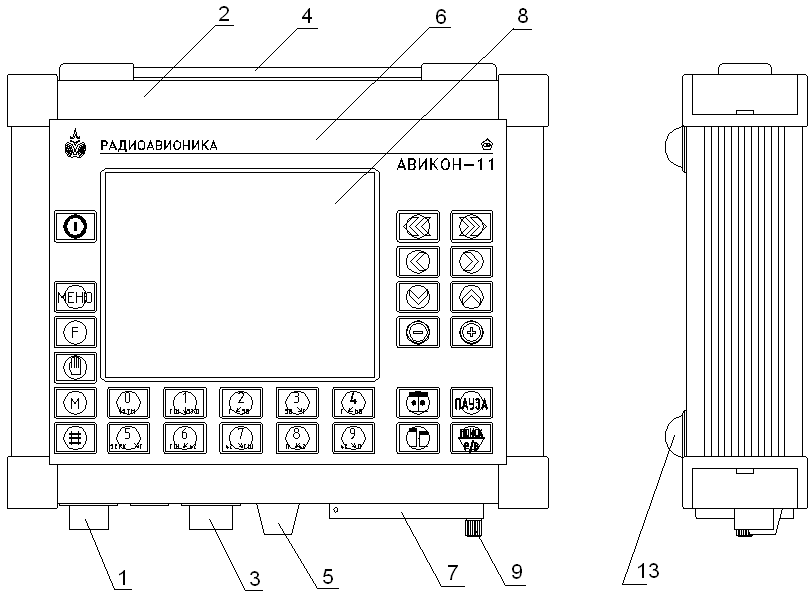1-разъем для подключения выносного пульта, 2-корпус, 3-соединительный разъем, 4-ручка, 5-муфта крепления, 6-кнопочная панель управления, 7-крышка, 8-ЖКИ, 9-фиксатор крышки, 10-USB порт, 11-COM-порт (RS-232), 12-разъем карты памяти, 13-опора