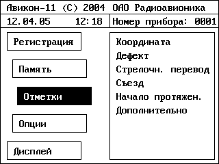 7.19.3 Кроме километровых и пикетных отметок оператор может заносить в память и другие отметки для привязке к плану пути. Для этого необходимо выбрать пункт «Меню/Отметки» (рисунок 18).