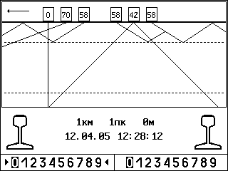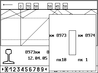 2 Цифры в нижнем ряду экрана ЖКД, расположенные слева, относятся к каналам сплошного контроля левой рельсовой нити; цифры справа – к каналам правой рельсовой нити.
